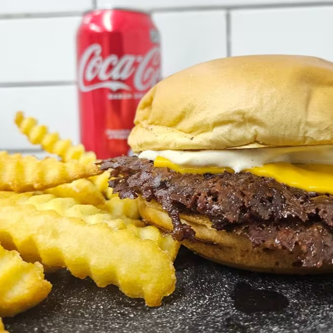 Pão brioche selado, 2 hambúrguer de 70g prensadinho na chapa, queijo cheddar e maionese da casa