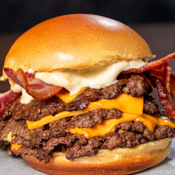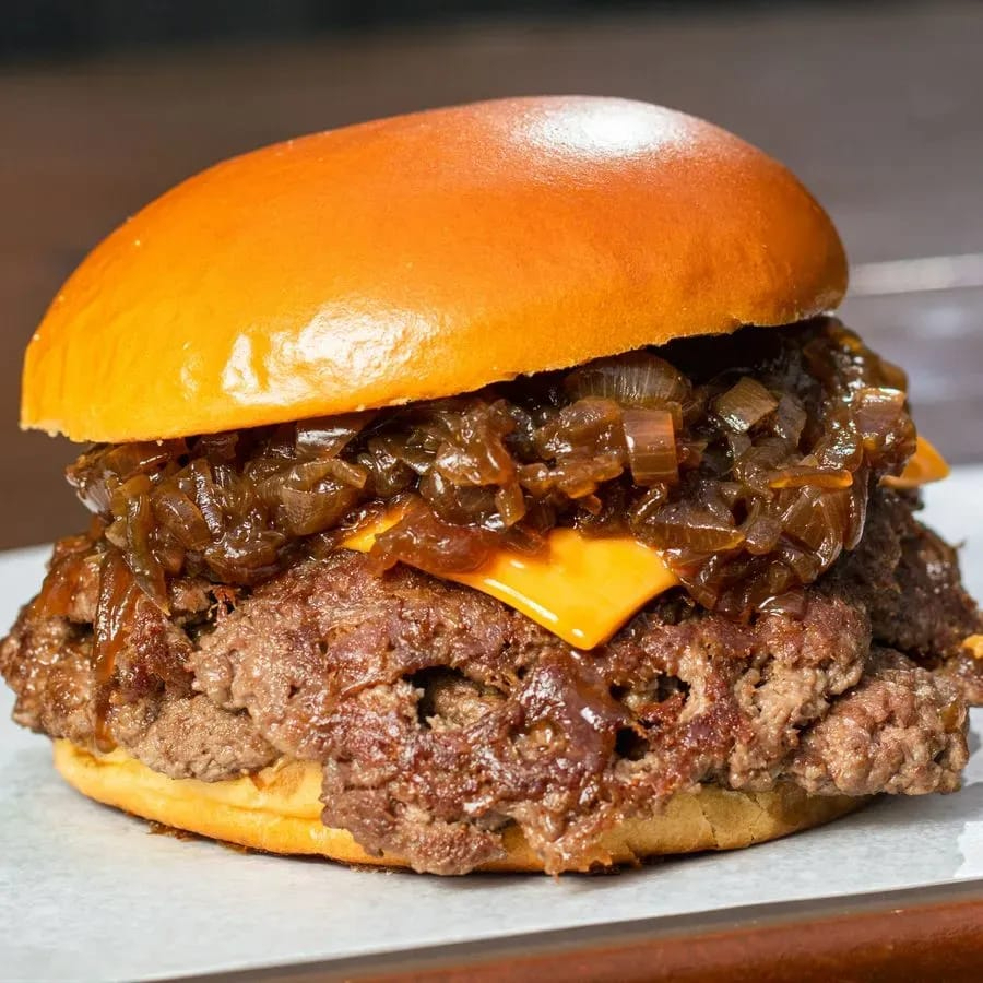 Pão brioche, maionese caseira, smash 70g cada, queijo cheddar fatiado polenghi e cebola caramelizada da casa na foto tamanho triplo
