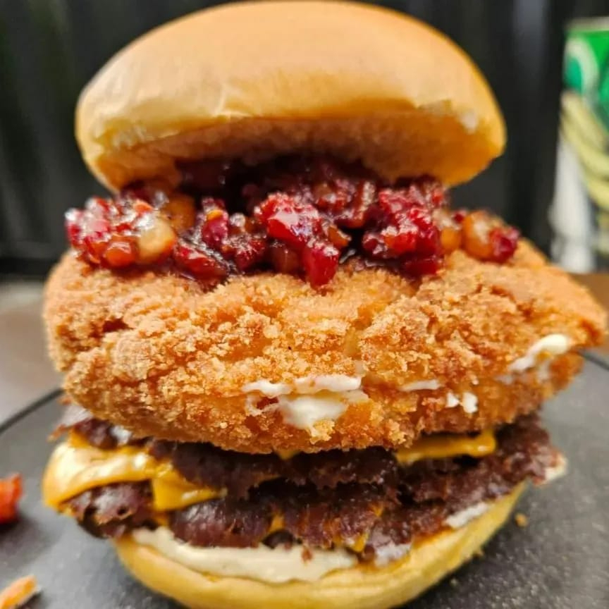 Duplo smash com queijo cheddar, Disco de catupiry 150g empanado e bacon caramelizado acompanhado da nossa maionese da casa
