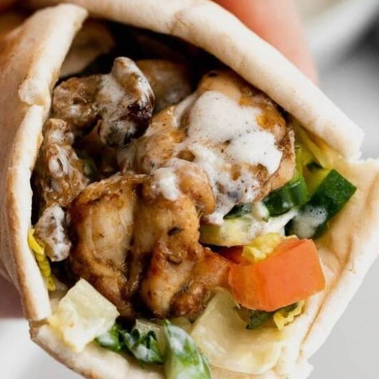 Pão sírio com frango, molho de alho artesanal, batata frita, tomate, alface e cebola.