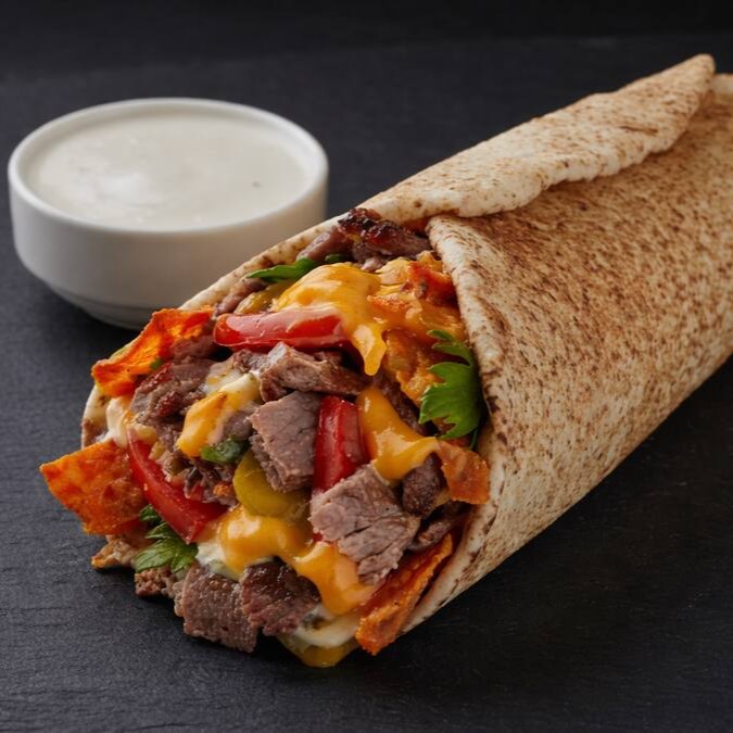 Pão sírio, carne, cheddar, Doritos, molho de pimenta, molho de alho, batata frita, tomate, alface e cebola.