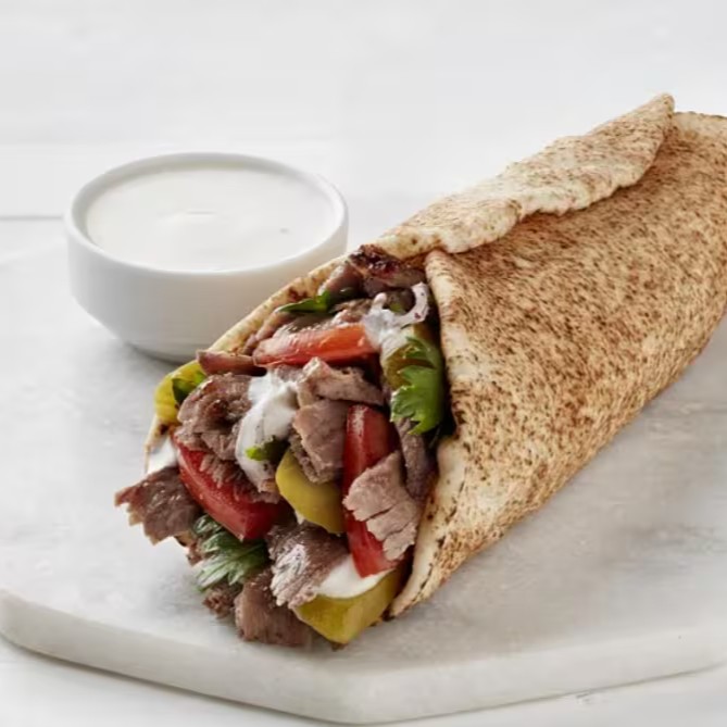 Pão sírio com carne, molho de alho artesanal, batata frita, tomate, alface e cebola.