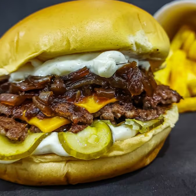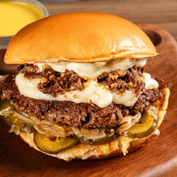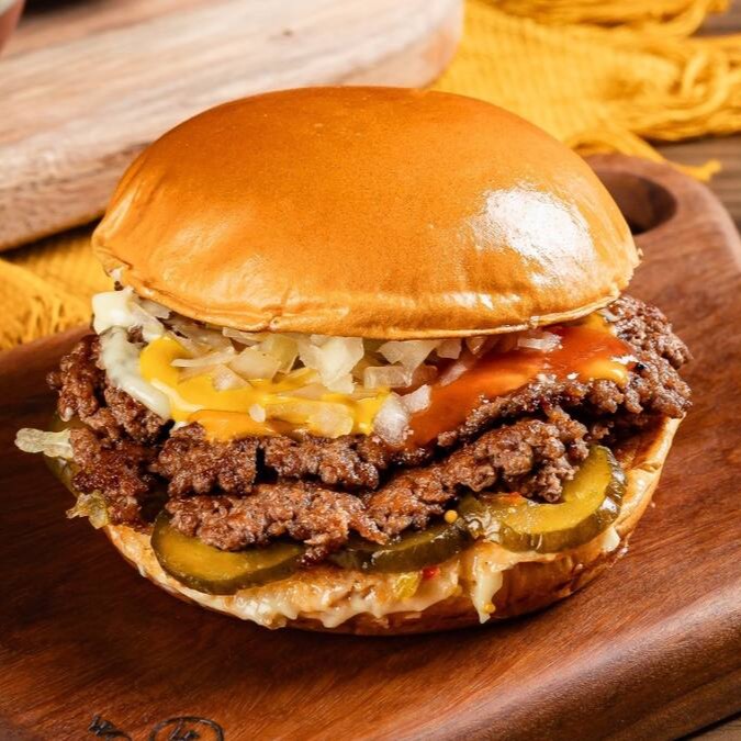 Pão de Brioche, Tostado na Chapa, 2x Carnes Smash, Queijo Cheddar em Fatias, Cebola Caramelizada, Picles Artesanal e Maionese Especial da Casa.
