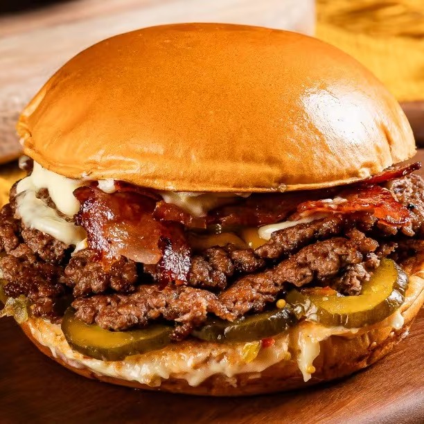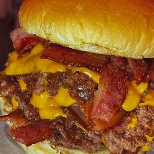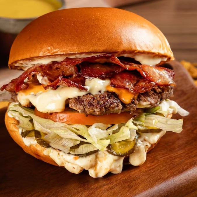 Pão de Brioche, Tostado na Chapa, 3x Carnes Smash, Queijo Cheddar em Fatias, Bacon em Fatias, Cebola, Ketchup, Mostarda, Picles Artesanal e Maionese Especial da Casa.