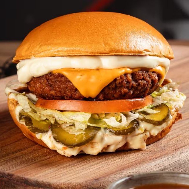 Pão de Brioche, Tostado na Chapa, Hambúrguer Vegetariano, Queijo Cheddar em Fatias, Alface Americana, Tomate em Fatias, Picles Artesanal e Maionese Especial da Casa.