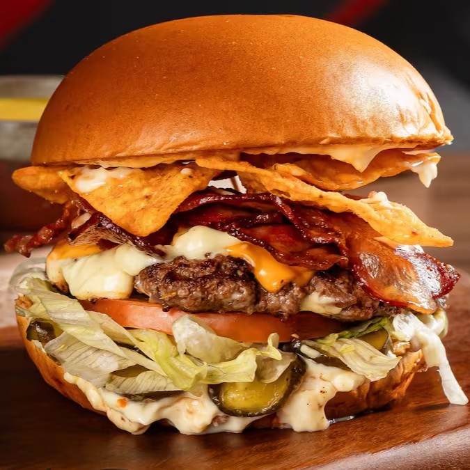 Pão de Brioche, Tostado na Chapa, Hambúrguer Artesanal Queijo Cheddar em Fatias, Doritos, Philadelphia, Sweet Chilli, Alface Americana, Tomate em Fatias, Picles Artesanal e Maionese Especial da Casa.