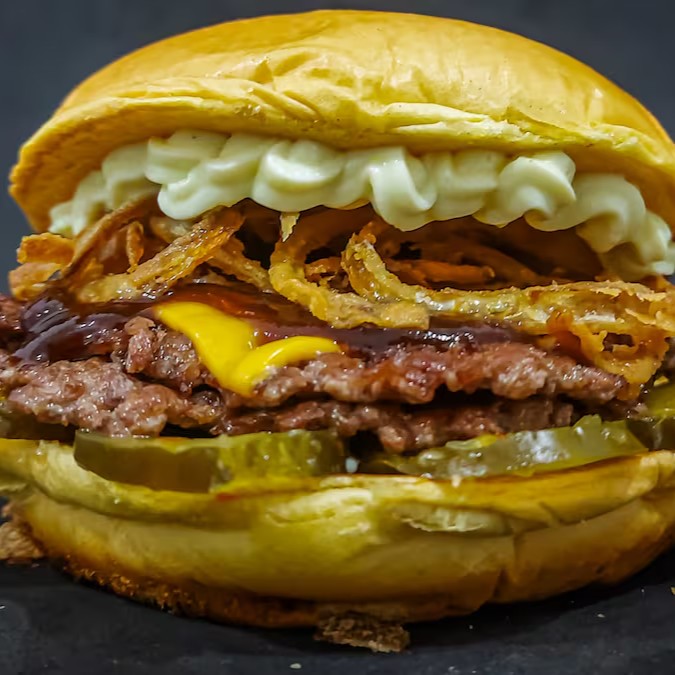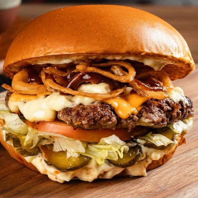 Pão de Brioche, Tostado na Chapa, 2x Carnes Smash, Queijo Cheddar em Fatias, Cebola Crispy, Barbecue, Picles Artesanal e Maionese Especial da Casa.