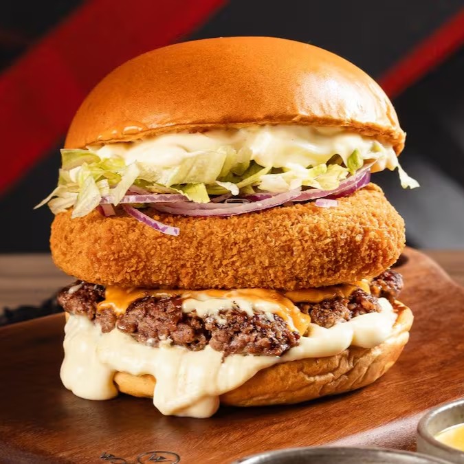 Pão de Brioche, Tostado na Chapa, Hambúrguer Artesanal, Queijo Cheddar em Fatias, Queijo Mussarela Empanado, Alface Americana, Cebola Roxa e Maionese Especial da Casa.