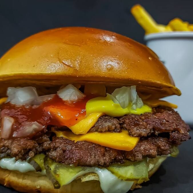 Pão de Brioche, Tostado na Chapa, 2x Carnes Smash, Queijo Cheddar em Fatias, Cebola, Ketchup, Mostarda, Picles Artesanal e Maionese Especial da Casa.