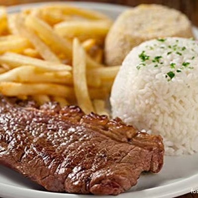 Arroz, feijão, batata frita e bife a cavalo.