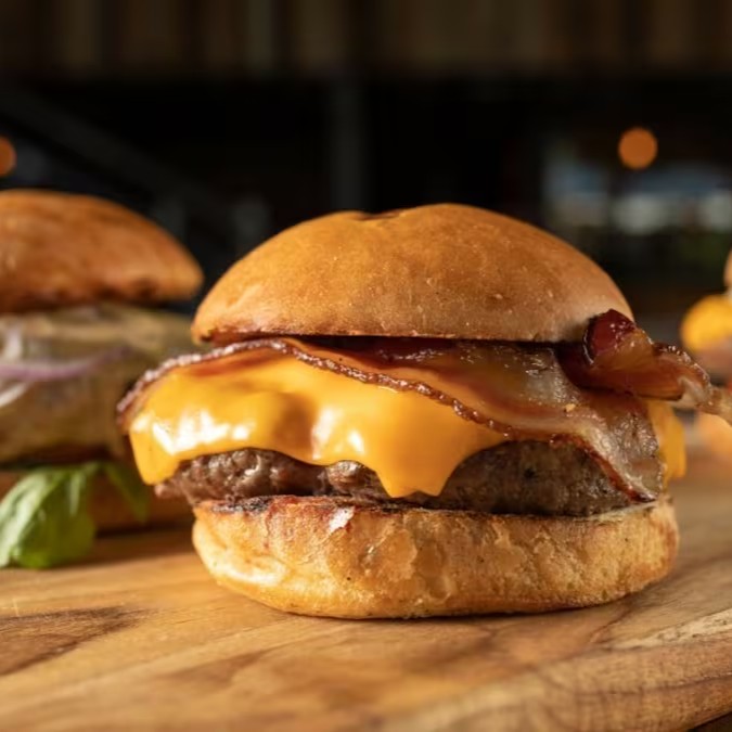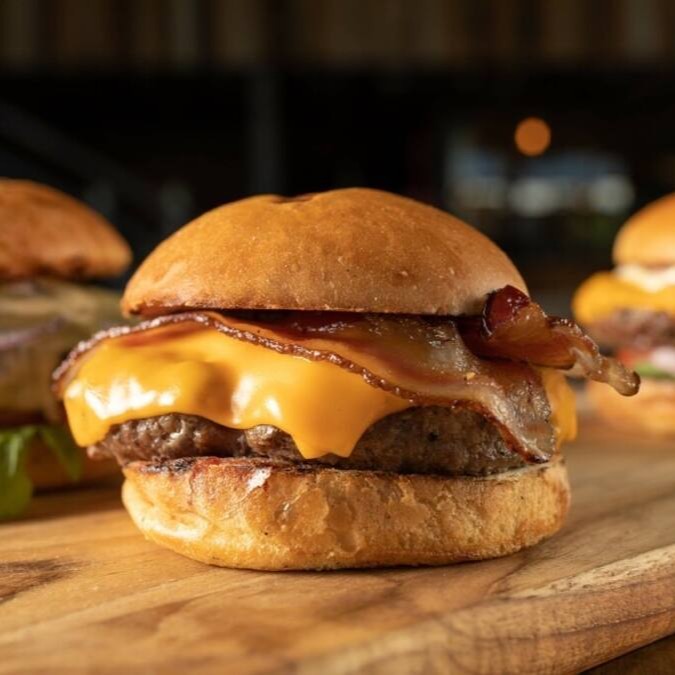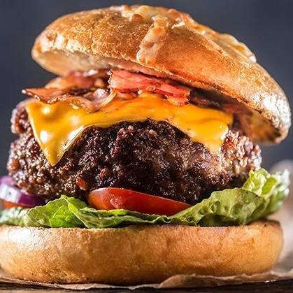 Pão , 160g de carne bovina , cebola caramelizada ,alface americana ,cheddar ,bacon e maionese gourmet. Acompanha Fritas.