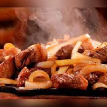 Iscas de picanha com pimentão, cebola e farofa.