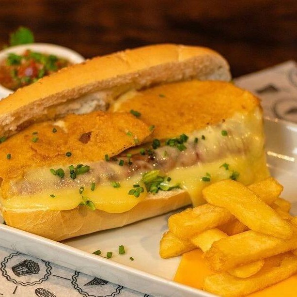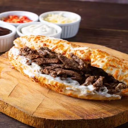 Pão baguete , mignon em cubos ,creme 4 queijos ,alface americana , maionese especial.