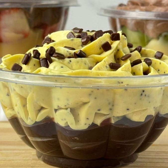 Nossos copos são feitos principalmente de mousses para equilibrar e suavizar o doce. No entanto, com base no feedback dos clientes, implementamos recentemente a opção 'Sou Time Brigadeiro' para os fãs de brigadeiro! Essa opção reduz a quantidade de mousse e adiciona uma camada extra de brigadeiro para um sabor mais doce. Os mousses são feitos a base de chantilly.