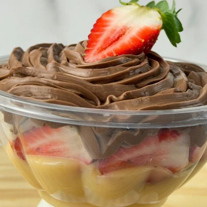 Copo recheado com morangos frescos, mousse de morango, mousse de leite Ninho, brigadeiro branco cremoso e suspiros.