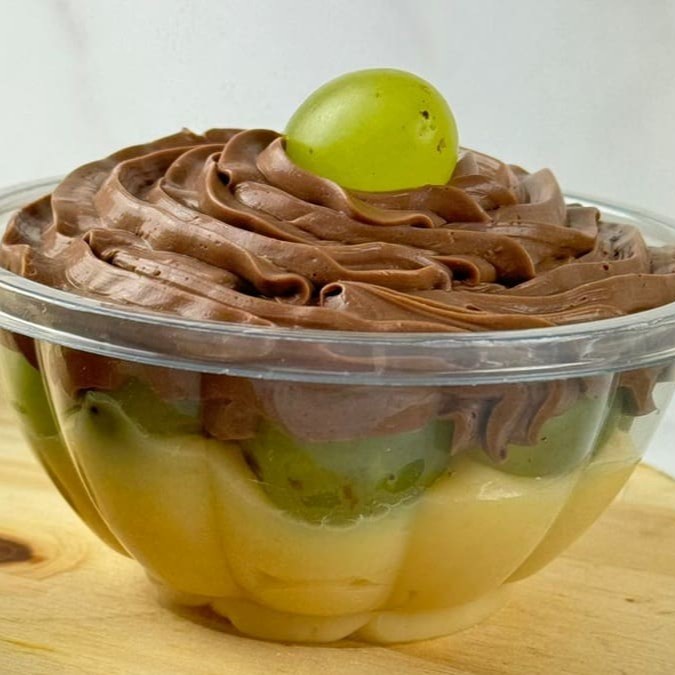 Copo recheado com uvas verdes, brigadeiro branco cremoso, creme de leite Ninho e suspiros.