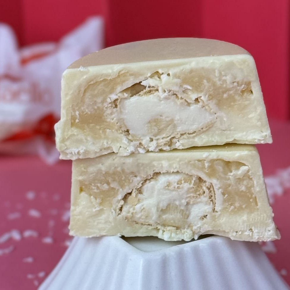 Delicioso bombom com casquinha branca, recheado com brigadeiro de coco, ganache de chocolate branco e bombom Raffaello inteiro.