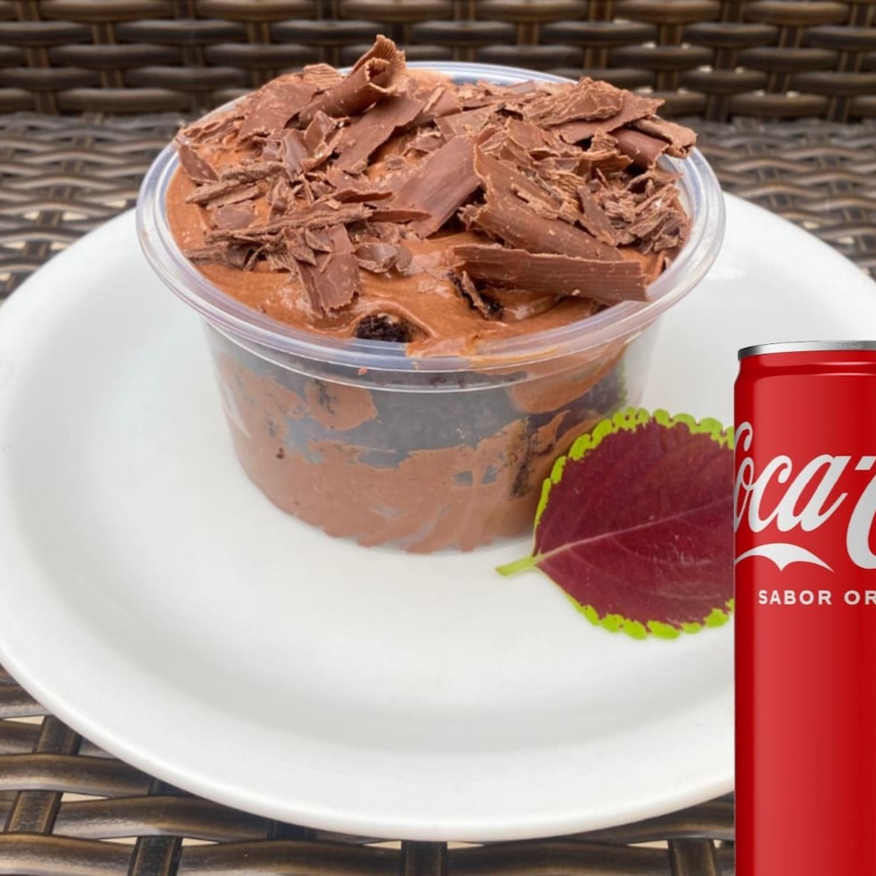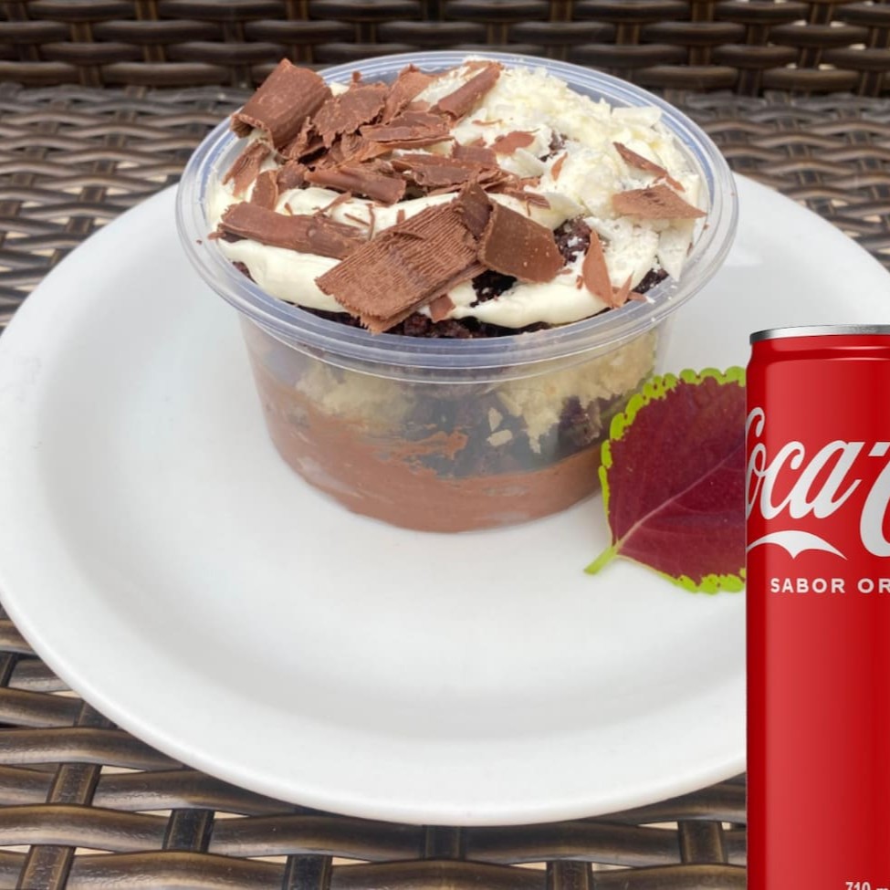 Massa Branca e Preta Molhadinha, Recheio de Quatro Leites e Mousse de Chocolate. Acompanha uma Coca-Cola lata geladinha de 310ml.