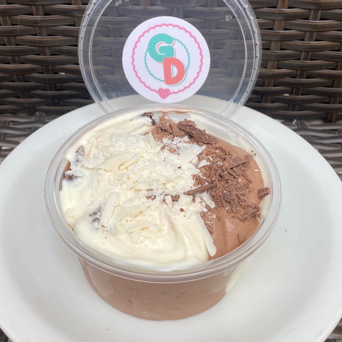 Deliciosa cobertura de Chocolate Ao Leite e Chocolate Branco, com Raspas de Chocolate ao Leite e Chocolate Branco.