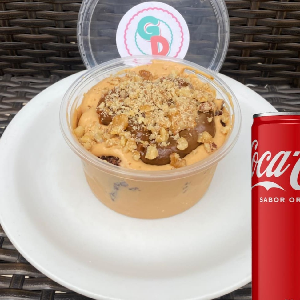 Pedaços de Brownie cobertos por um delicioso creme de Doce de Leite com Nozes. Acompanha uma Coca-Cola lata geladinha de 310ml.