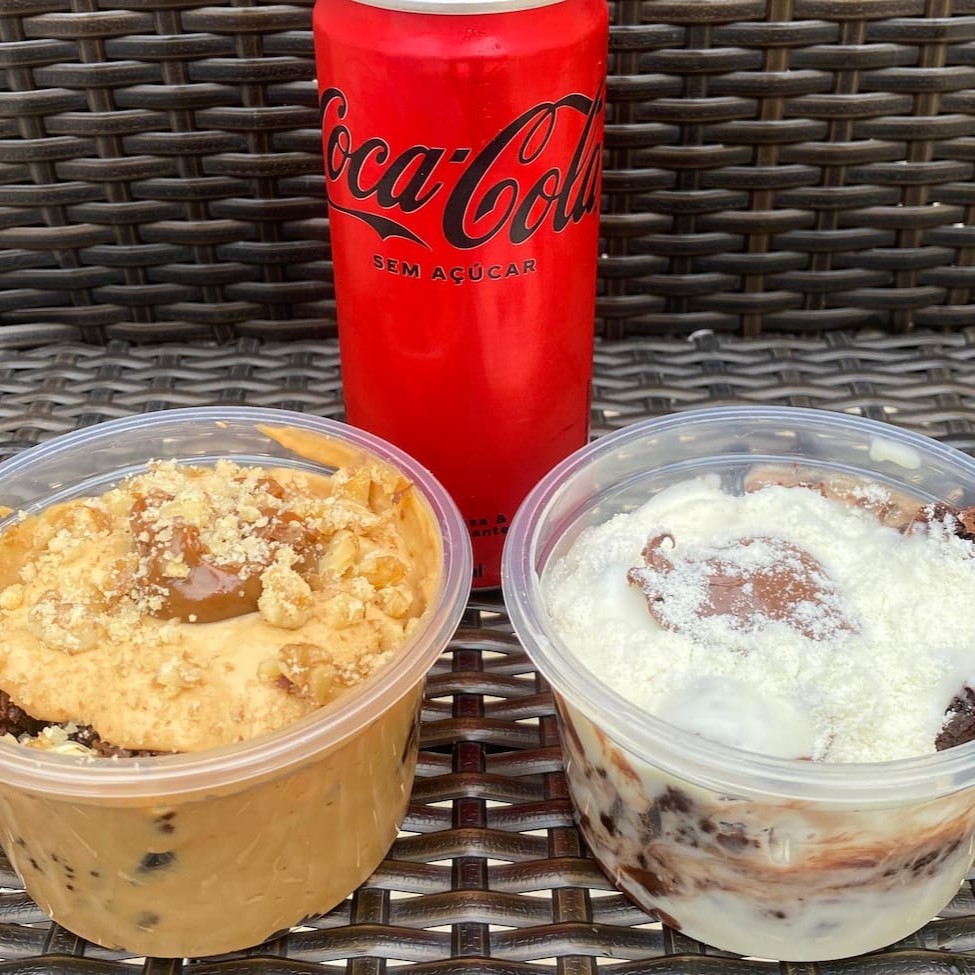 Pedaços de Brownie cobertos por um delicioso creme de chocolate branco com paçoca. Acompanha uma Coca-Cola lata geladinha de 310ml.