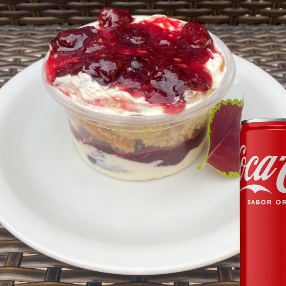 Massa de Iogurte Molhadinha Com Recheio Quatro Leites e Frutas Vermelhas. Acompanha uma Coca-Cola lata geladinha de 310ml.