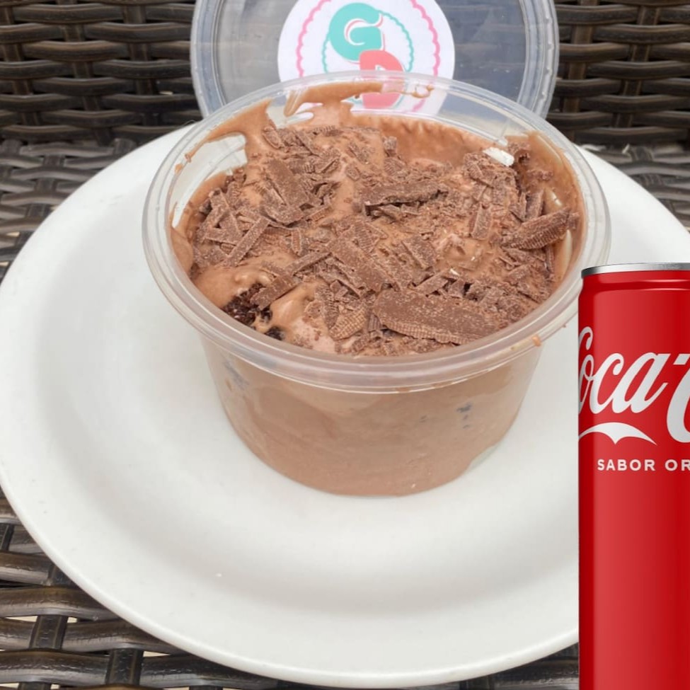 Pedaços de Brownie, cobertos por uma deliciosa combinação de creme de Chocolate Ao Leite e creme de Chocolate Branco. Acompanha uma Coca-Cola lata geladinha de 310ml.