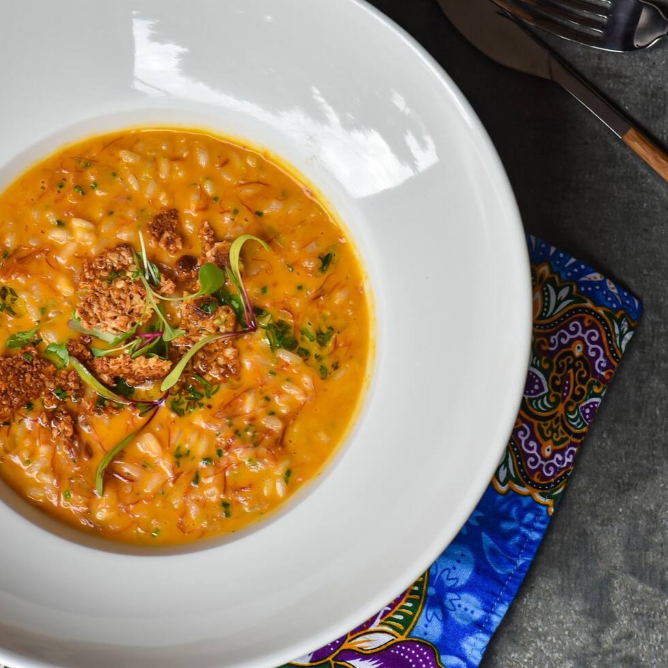 Nosso risoto é feito com arroz carnaroli, queijo grana padano, creme de abóbora cabotiá e bacon crocante