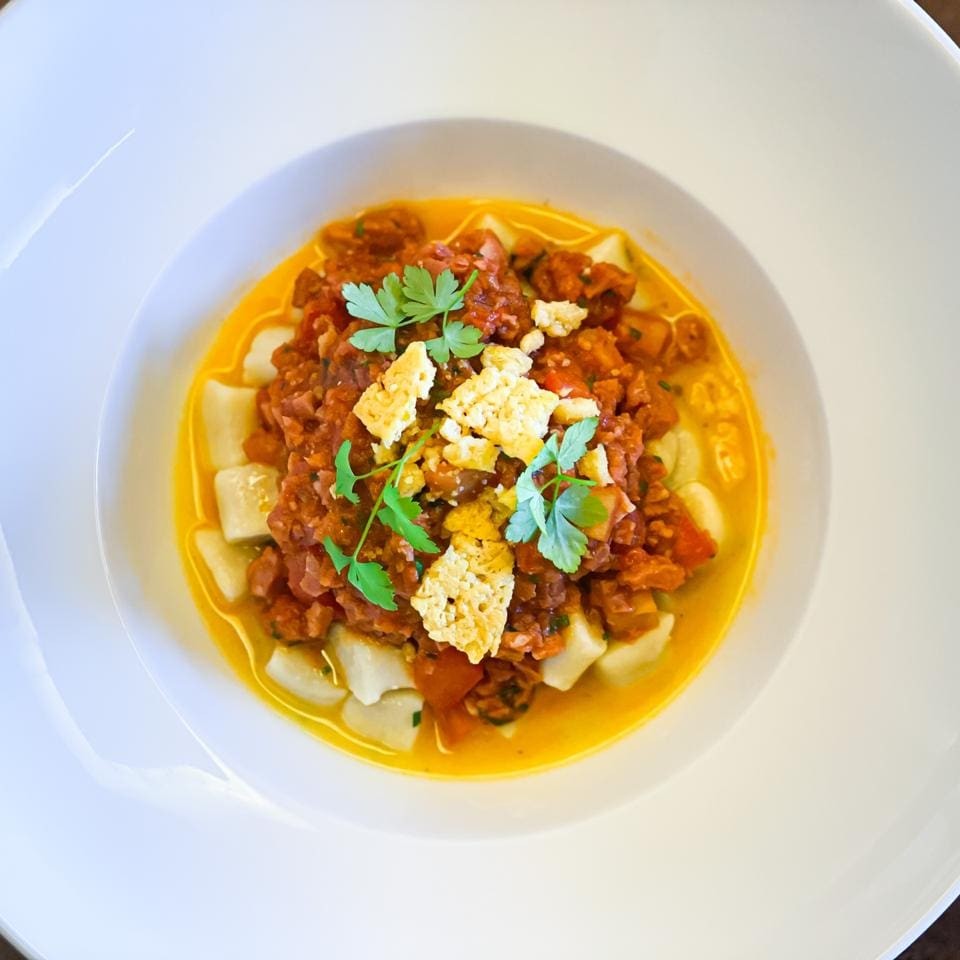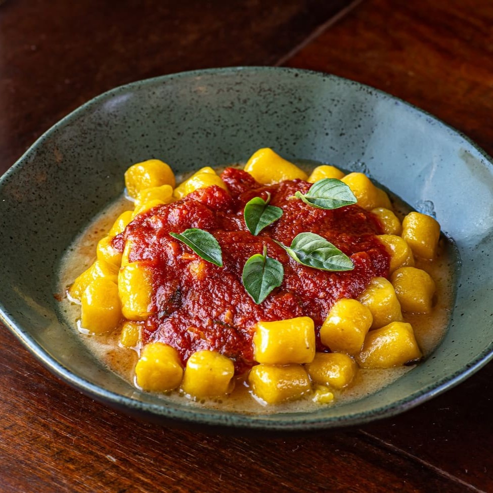 Nhoque de batata salteado no molho de tomate caseiro com linguiça blumenau, servido com crocante de queijo