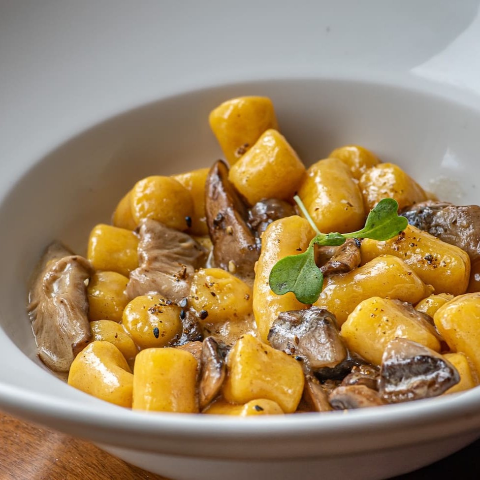 Gnocchi de batata com mix de cogumelos frescos salteados em um molho cremoso de queijo.