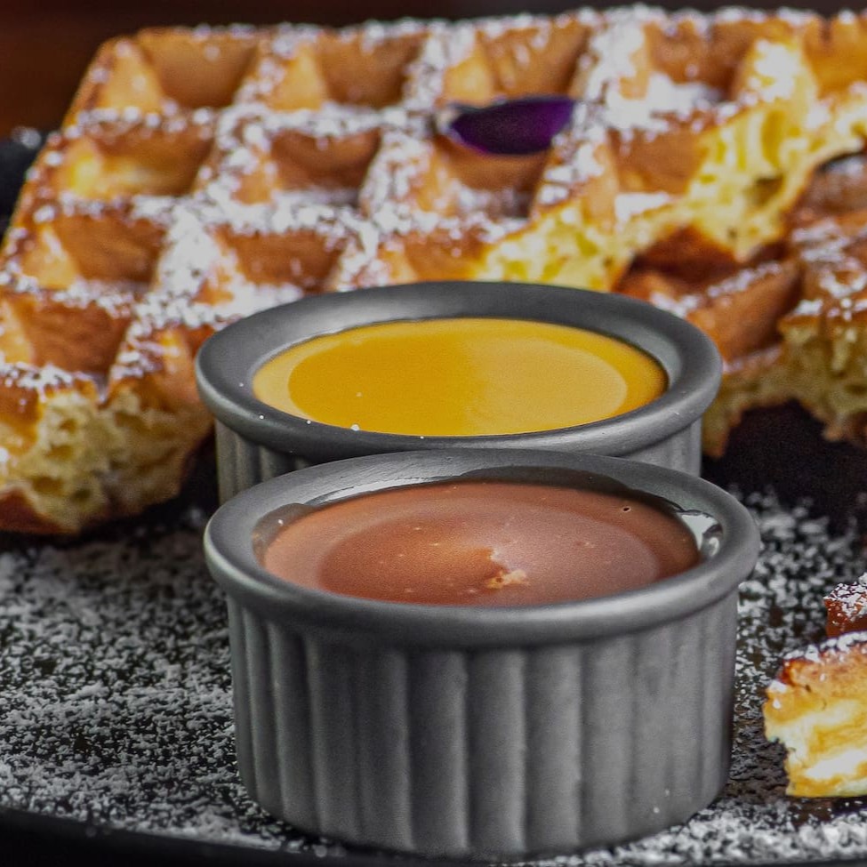 Nossa massa de waffles tem um toque de laranja e acompanha calda de chocolate e doce de leite