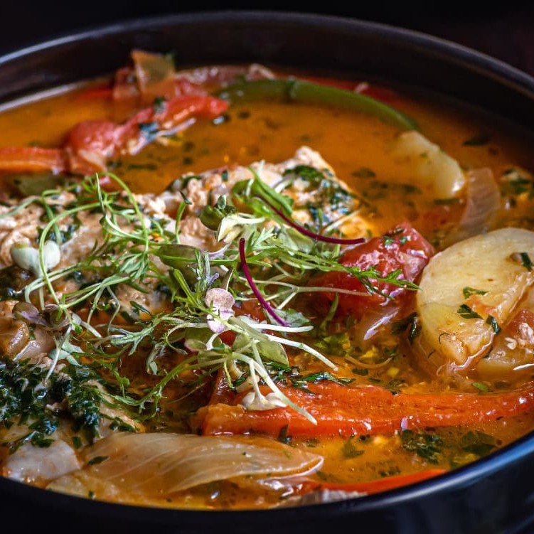Peixe cação, camarões, pimentões, tomate, azeite de dende em um molho marcante. Acompanhada de arroz basmati e farofa de mandioca com castanhas brasileiras