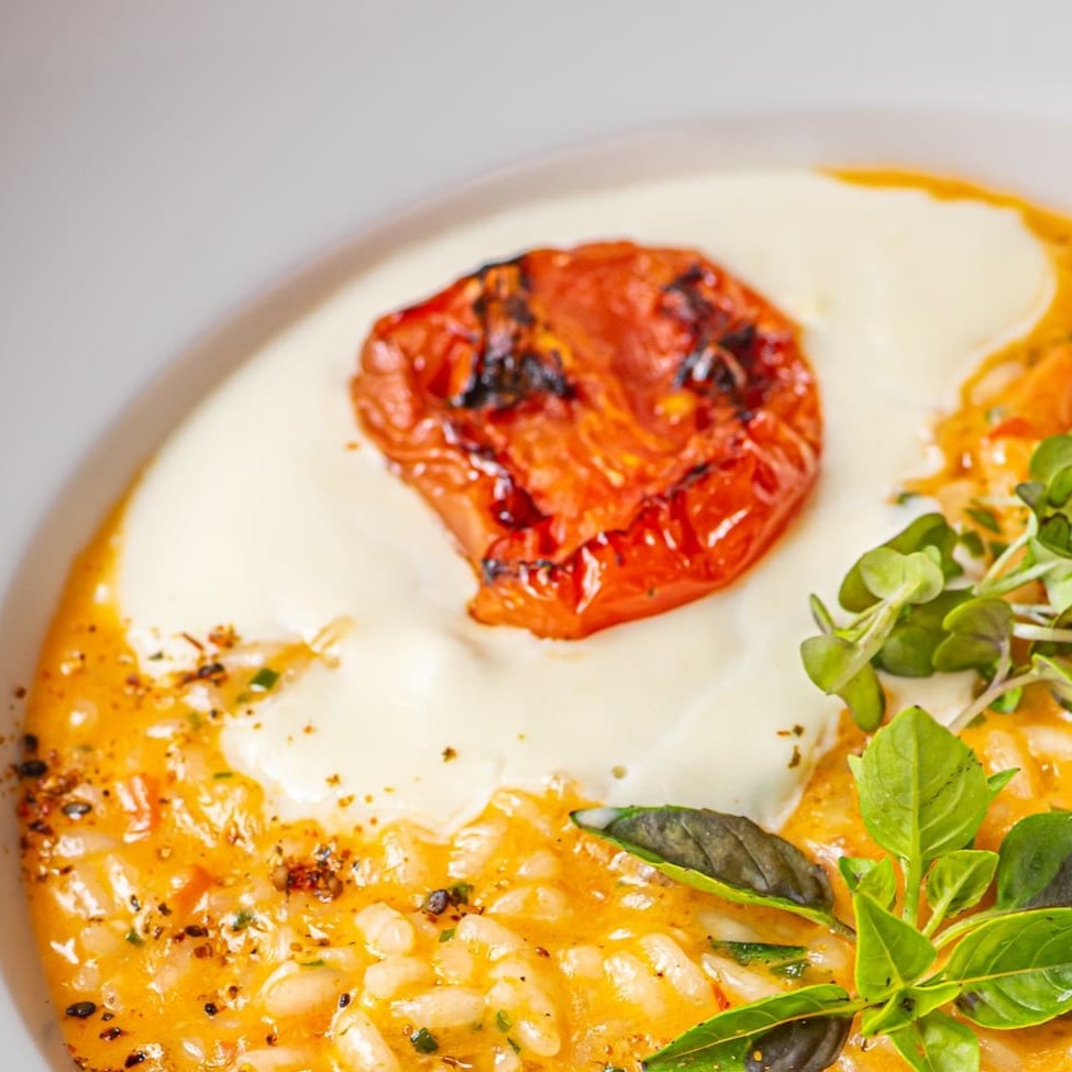 Nosso risoto é feito com arroz carnaroli, queijo grana padano, molho de tomate, manteiga, manjericão, e creme de queijo especial