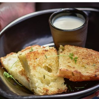 Focaccia artesanal da casa com creme de queijos grana padano e o brasileiríssimo mandala.