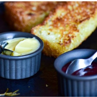 Focaccia artesanal da casa com manteiga e a deliciosa geleia de frutas vermelhas.