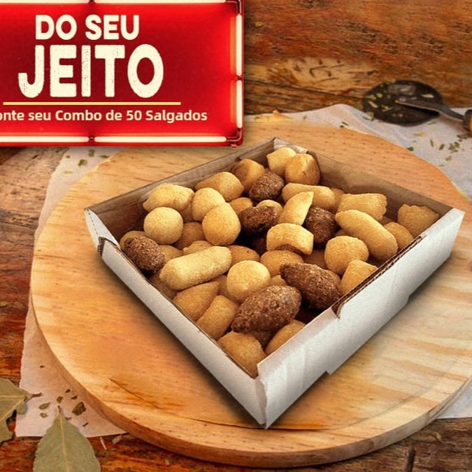 Tudo o que vocês precisam agora é desse combo delicioso!! 50 Salgados ( escolha o seu salgado ) ( Os salgados são de 18g a 20g e vai dois sache de maionese, dois sache de ketchup e dois sache de mostarda )