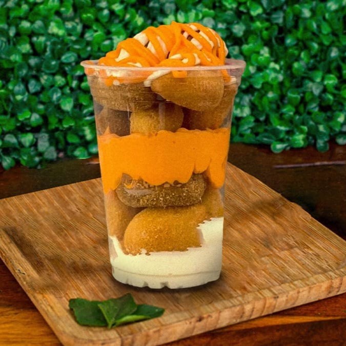 Em um copo de 500 ml nossos maravilhoso churros de doce de leite, em varias maravilhosas camadas intercaladas com doce de leite.