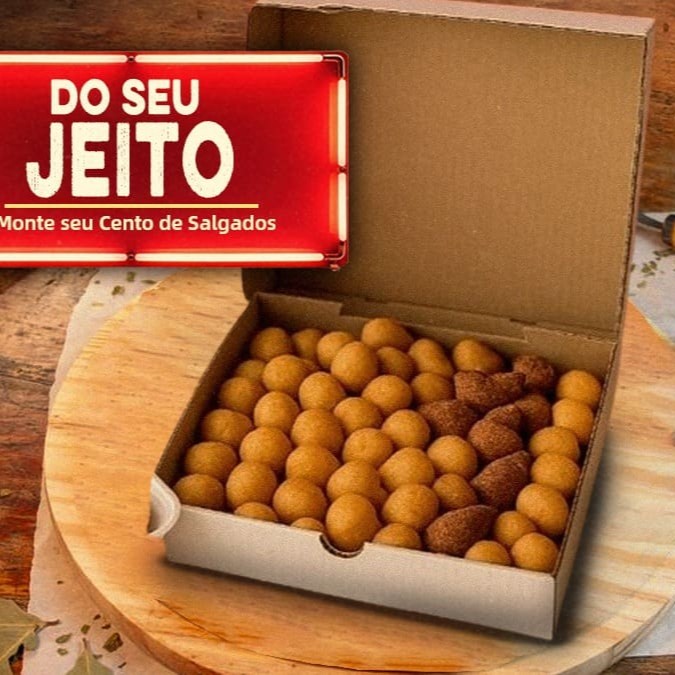 Chama toda a galera e vem montar seu Cento de Salgados!!! ( escolha os seu salgados ) Bora pedir essa delícia? ( Os salgados são de 18g a 20g e vai dois sache de maionese, dois sache de ketchup e dois sache de mostarda )