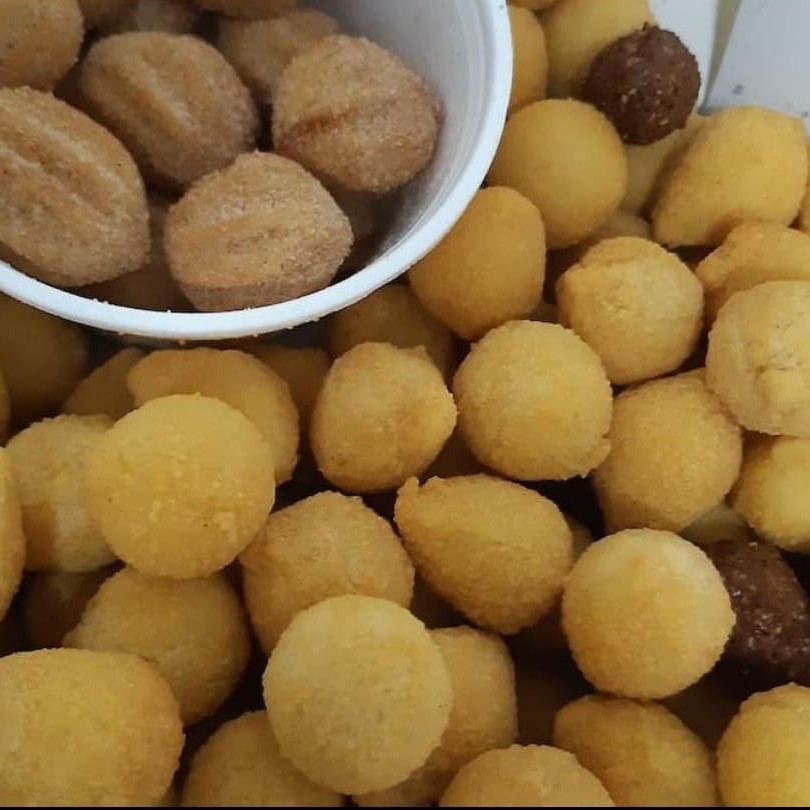 Deliciosas bolinhas de queijo pesando de 18 a 20 gramas cada unidade.