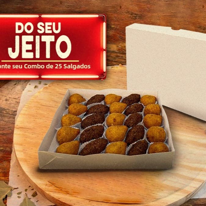 Monte seu combo 25 salgados deliciosos!! ( escolha os seus salgados ) Não vai perder de pedir essa maravilha né? ( Os salgados são de 18g a 20g e vai dois sache de maionese, dois sache de ketchup e dois sache de mostarda )