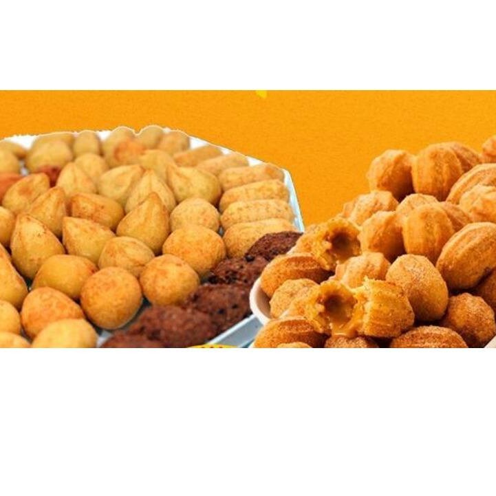 100 salgados mistos de 18a20gramas(coxinha de frango,coxinha de calabresa, Kibe,bolinha de queijo e bolinha de pizza e risole de carne) e ganhe 10 mini churros de doce de leite