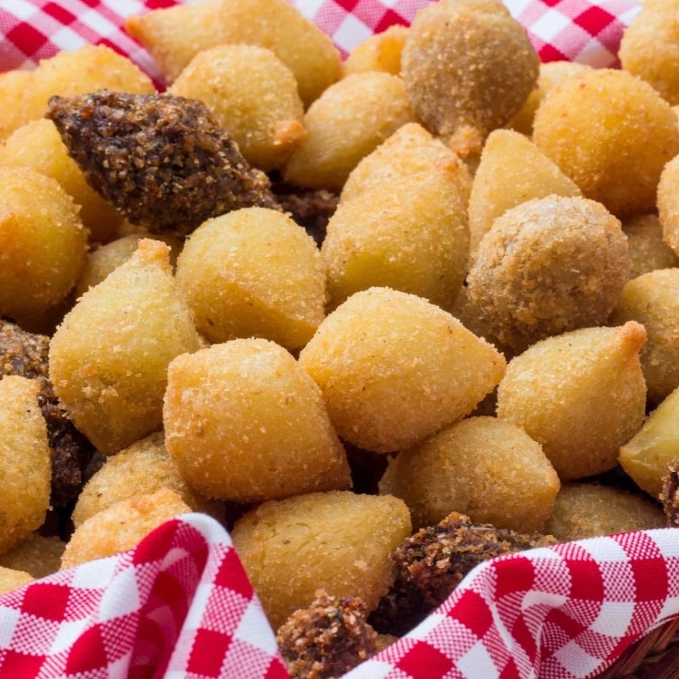 100 deliciosos mini salgados mistos de 18 a 20g, contendo coxinha de frango,coxinha de calabresa,bolinha de queijo, bolinha de queijo e presunto e kibe