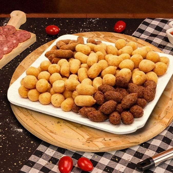 50 deliciosos mini salgados de 18 a 20g, contendo coxinha de frango,coxinha de calabresa,bolinha de queijo, bolinha de presunto e queijo, e kibe
