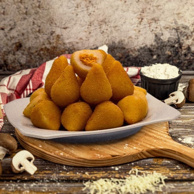 Deliciosas coxinhas de frango de 18 a 20 gramas.