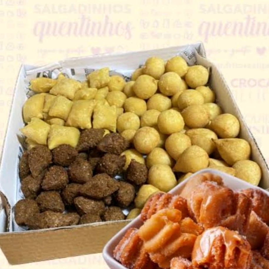 200 salgados mistos, 50 deliciosos churros de doce de leite e brinde um refri 2 litros