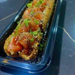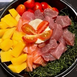 Atum e salmão em cubos, manga, tomate cereja, cream cheese , couve crispy e Shari ( arroz temperado )