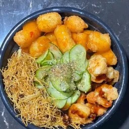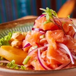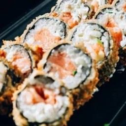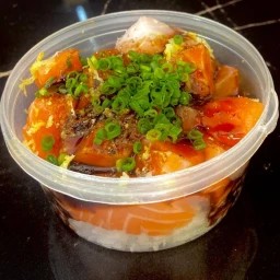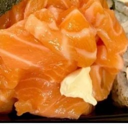 Cubinhos de Salmão batido . Arroz . Cream cheese . Floco de arroz.