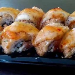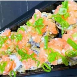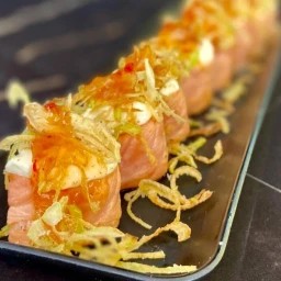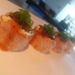 Salmão e cream cheese, finalizado com sweet chili e crispy de alho poró.