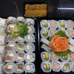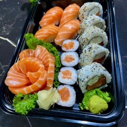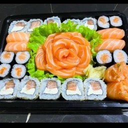 10 Fatias de Sashimi de Salmão. 10 Un Uramaki Filadélfia. 8 Un Hossomaki Salmão. 4 Un Niguiri de Salmão. 2 Un Jow de Salmão.