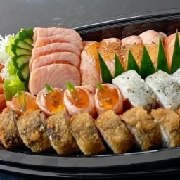 Combinado de salmão 18 un 5 un de sashimi de salmão 5 un de uramaki Filadélfia 4 un de niguiri de salmão 4 un de hossomaki de salmão